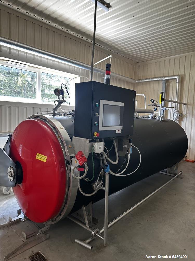Used- Lagarde 2B E autoclave, manufactured in 2021, is a static retort autoclave with a horizontal cylindrical chamber and a working volume of 5,490 liters. The vessel has an internal diameter of 1,300 mm and is mounted on two support legs, designed to process four baskets supported by two internal guide rails. The unit is equipped with a steam injection and distribution ramp, a water suction system with filter plate, and a water distribution ramp with spray nozzles positioned above the baskets. Process operations including heating, cooling, pressure regulation, and draining are controlled by automatic valves, while pressure gauges and sensors mounted on top of the vessel provide monitoring. The vessel body, internal components, rails, steam ramp, and external piping are constructed from AISI 304 stainless steel, and the painted steel control cabinet, mounted on the right side, includes a touchscreen HMI and emergency stop controls. The autoclave operates at a service pressure range of 0 to 5 bar (relative) with a maximum operating temperature of 158 C, and requires a 400 V, 50 Hz electrical supply. Our freight Specialists Can Assist with any Customs Documentation and forms to ensure a smooth transition. This unit is basically Unused. Seller did one (1) test with glass jars containing Soups inside.