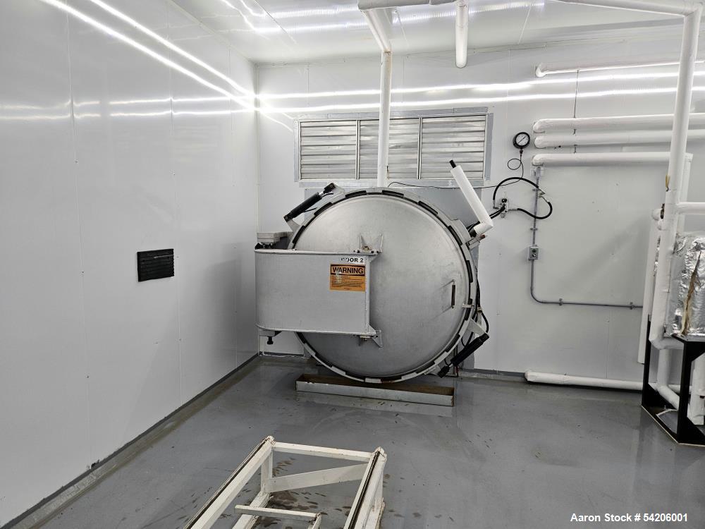 Used WSF Industries Horizontal Double Door Pressure Vessel/Autoclave. 30psi at 275 degrees F MAWP. -20 degrees F at 30 psi MDMT. 40' internal length x 5'3" internal dia. Steam heat source. (2) Hydraulic hinged doors. (2) different sets of roll carts and bins. NB #17031. Rebuilt in 2019.
