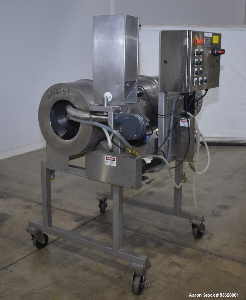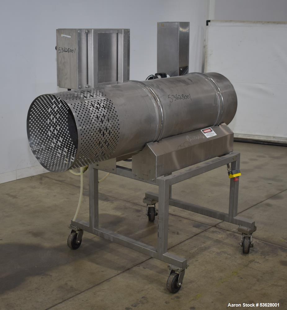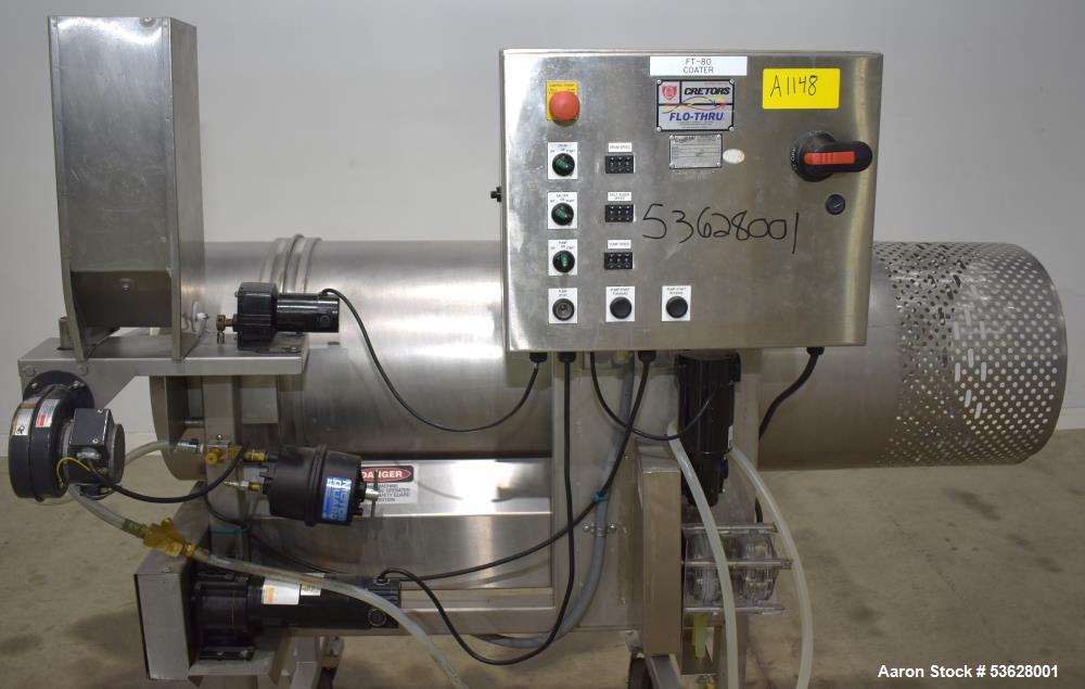 Used Cretors / Flo-Thru Model FTSC80-A2R-PPOM-M Coating Drum, Stainless Steel. 18" diameter x 64" long drum with internal baffles and perforations. Driven by an approximate 1/8hp, 90v 250rpm motor. Includes spray nozzle and coating system. Mounted on casters. Serial# 13093856. 1/60/120 Volt, 7 Amp.