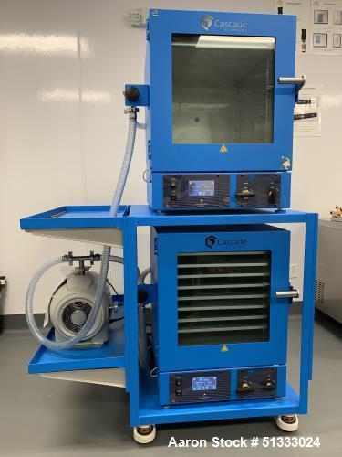 Used Cascade Sciences Double Up Vacuum Oven Package. (2) Model CVO-5 Vacuum Ovens, 5 cubic foot per oven, Rear KF-25 port allows for rapid MAXEVAP purging or running feedthroughs inside oven for monitoring, 120V or 220V power. Includes: Agilent IDP15 9 CFM Oil-free scroll pump and Cascades MAX EVAP Connection Kits in each oven. Last used in a Cannabis application.