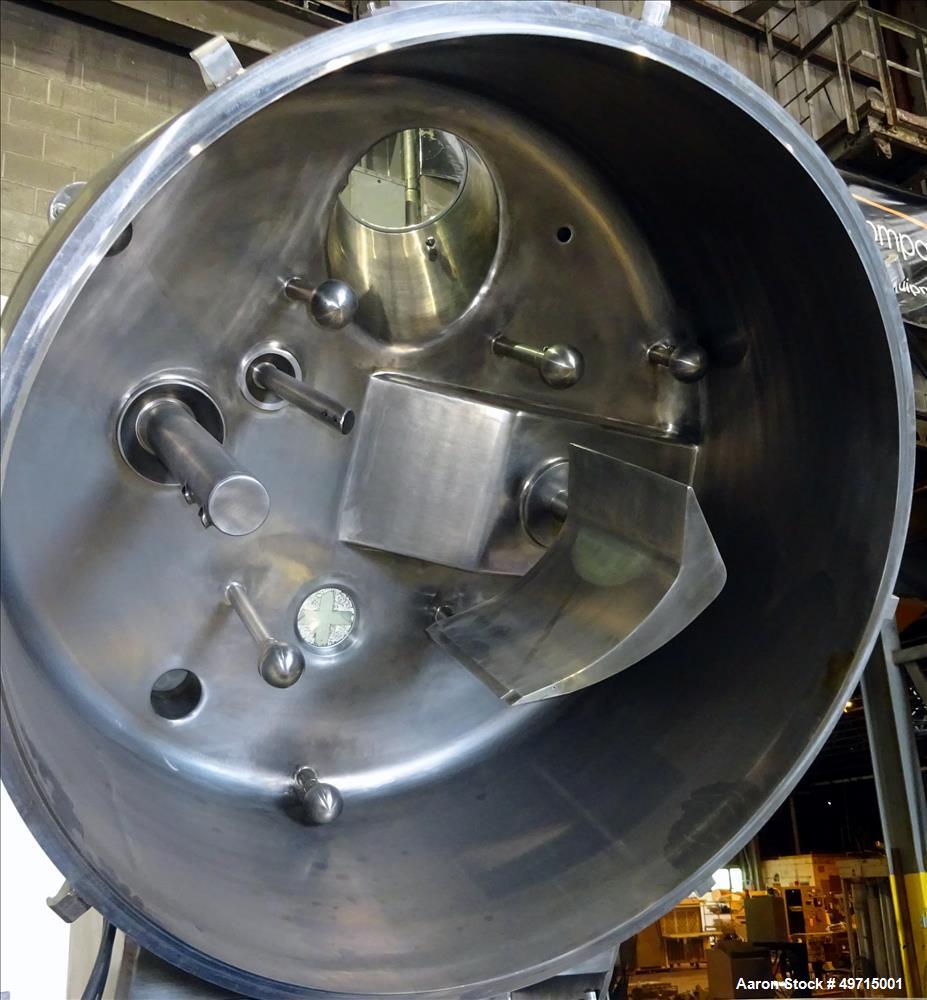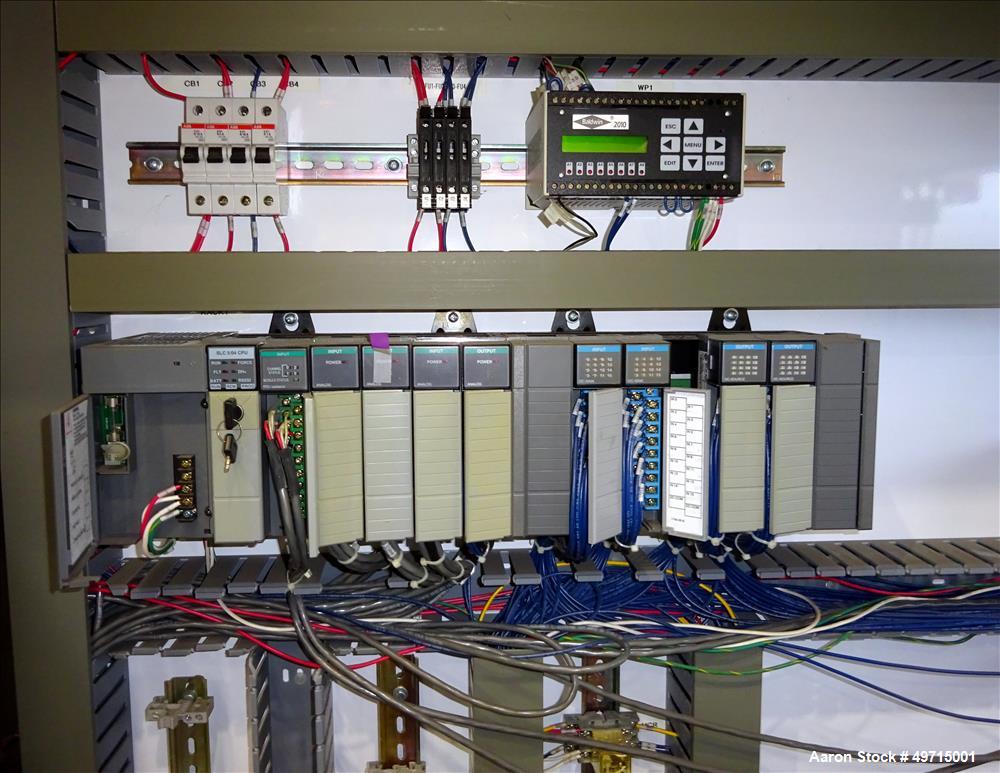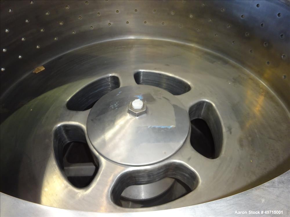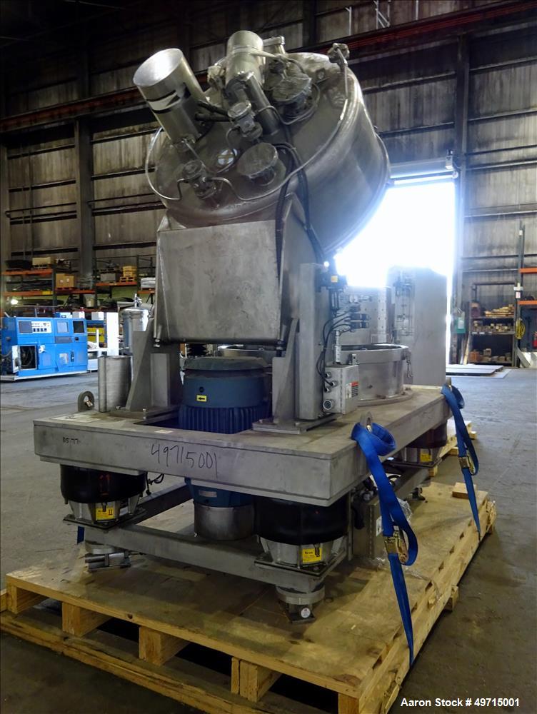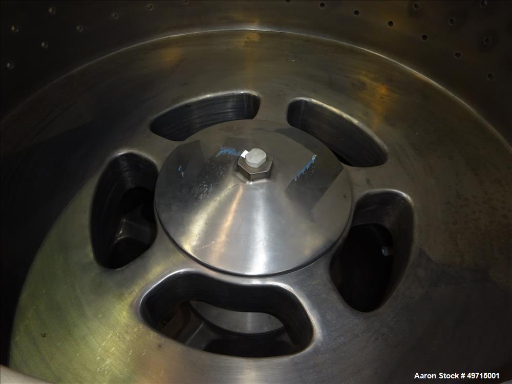 Used Andritz P2000 95 Liter Vertical Peeler Centrifuge. Hastelloy C22 for all product contact areas. Basket dimensions are approximate 38" x 12". Maximum cake thickness 4.5". Filtration surface area 9.95 square feet. Total cake volume 3.3 cubic feet. This unit produces a maximum of 1450 Gs. Basket wetted surface finish is 240 grit (B-8) polish. Features include cake wash, plow at high speed, air knife, cake back plow, feed pipe wash, air knife wash, upper basket wash, basket wash, back blow wash, lower basket wash, cake discharge wash, basket vibration, controls with purgestation. 20 hp, 3/60/480/1795 rpm/ 50 hp, 3/60/460/1775 rpm dual Inverter duty master motor XP rated. Top cover openings: 8" sight glass, 3", 2-1/2", 1-1/2", (7) 1". 24" bottom outlet. Control panel with SLC/5/04 CPU PLC. MISSING OPERATOR CONTROL CABINET.