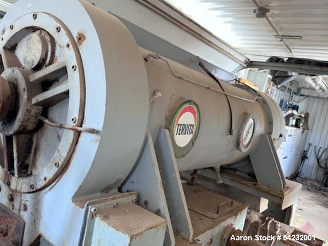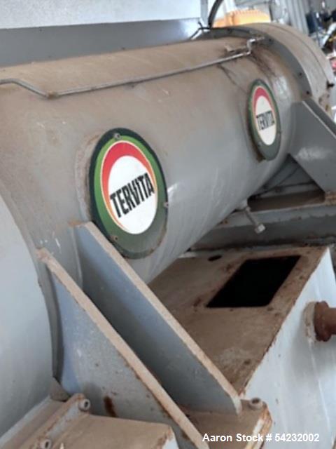 Used- Flottweg Z4D/4-454 Solid Bowl Decanter Centrifuge. 316 Stainless Steel construction (product contact areas), maximum bowl speed 3500 rpm, approximate 5" single lead conveyor with welded hardfacing. Rotodiff backdrive with powerpack, feed pipe, lubrication system, adjustable liquid plate dams, 30 KW (40.2hp) ABB main drive motor with fluid coupling, frame/casing, vibration isolators, safety guards. Last used for wastewater treatment.