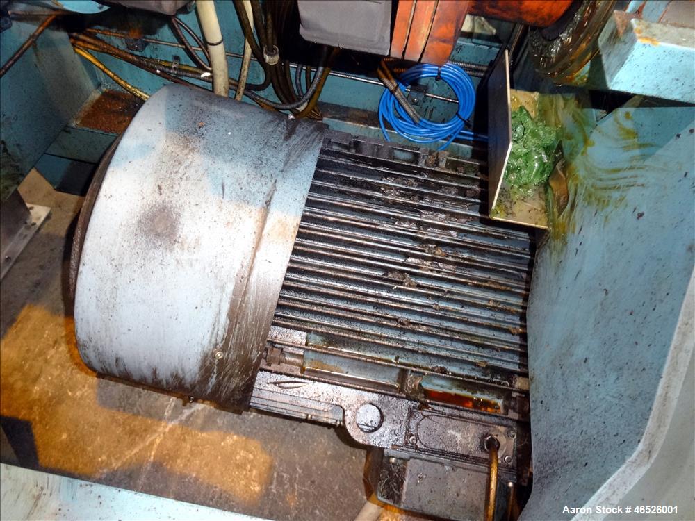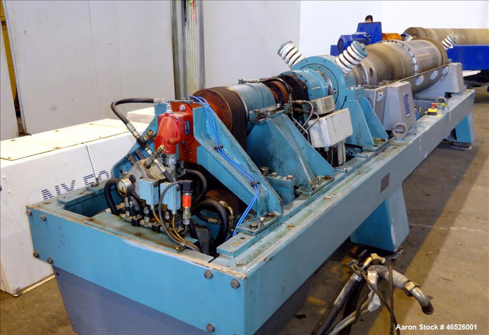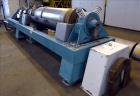 Used Alfa Laval AVNX-5060B-31G Solid Bowl Decanter Centrifuge, 316 Stainless Steel construction (product contact areas), maximum bowl speed 2700 rpm, 70 mm single lead conveyor with welded hardfacing, single row lined cake discharge ports, moon liquid plate dams, base, casing, gearbox, standard feed pipe, 45 kw maindrive motor 380/3/50, safety guards, hydraulic backdrive, mounted on (4) legs. Built 1989.