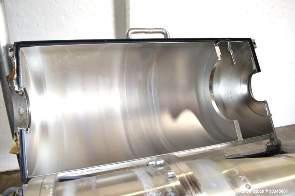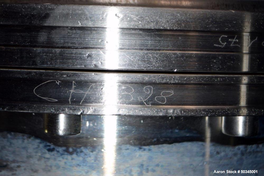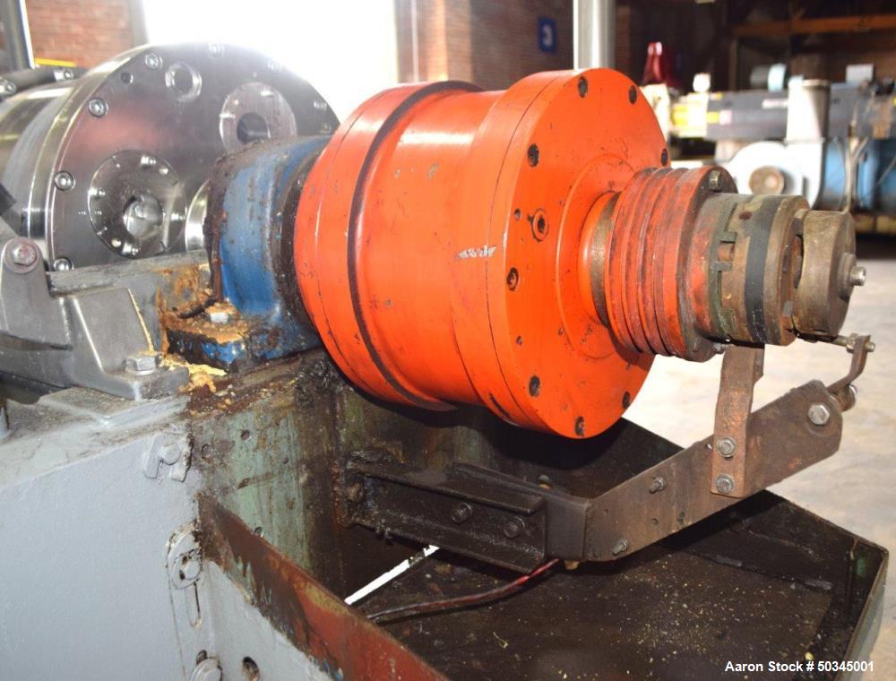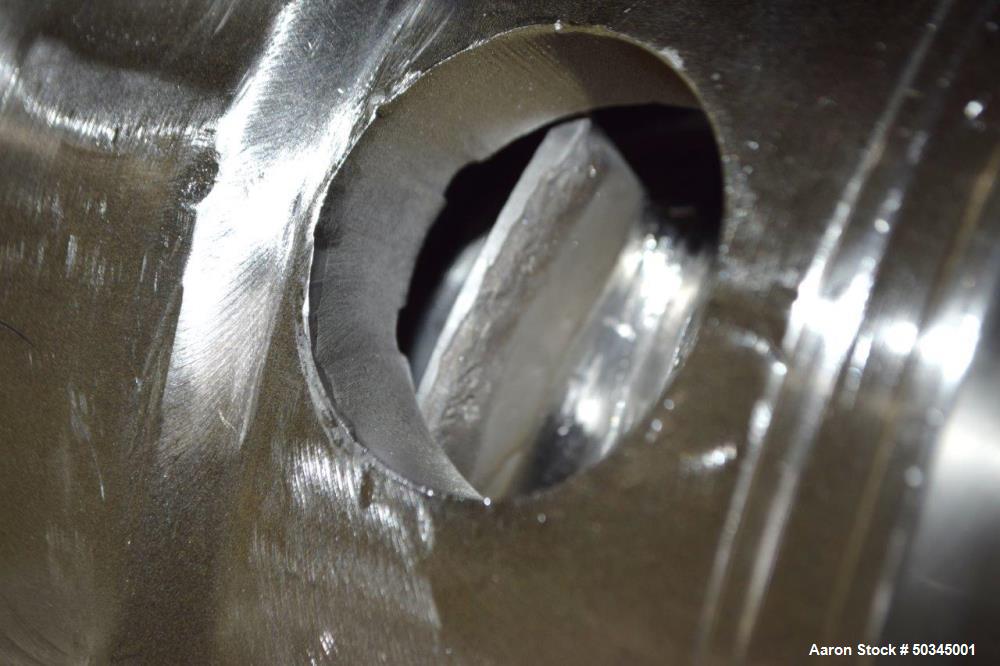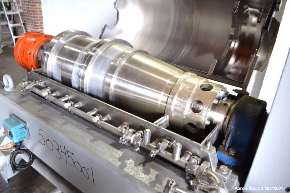 Used Alfa Laval NX-414 "Semi-Sanitary" Solid Bowl Decanter Centrifuge. 316 Stainless Steel construction (product contact areas), maximum bowl speed 4000 rpm, 110mm single lead conveyor, base, casing, 3.5 knm gearbox. 40 hp Drive motor, clean-in-place spray header, feed pipe. Includes spare parts.