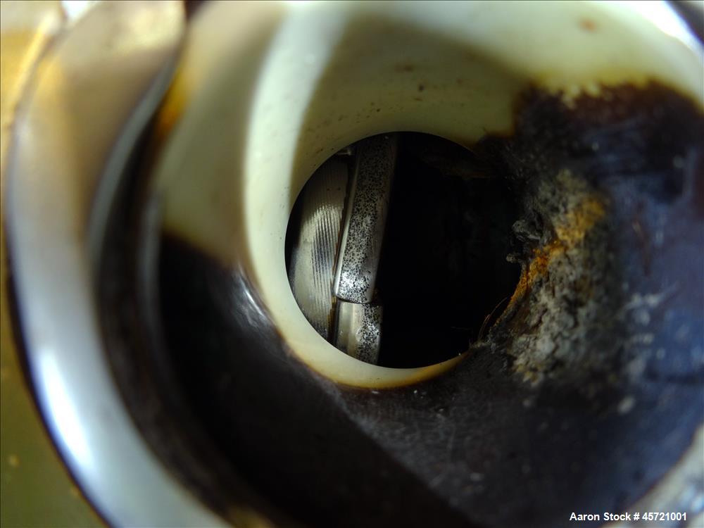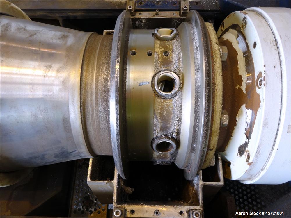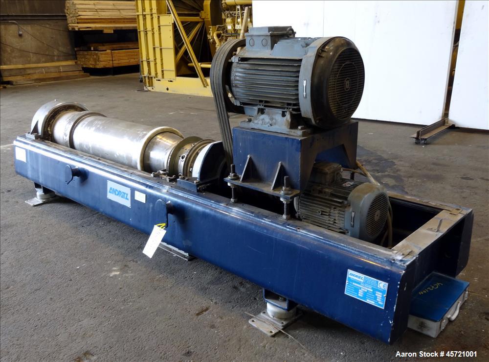 Used Andritz D3LL-C30CHP Solid Bowl Decanter Centrifuge, 316 Stainless Steel (product contact areas). Maximum bowl speed 4000 rpm, 10 degrees beach contour, 6" Single lead conveyor with single row lined discharge ports and wear inserts, adjustable plate dams, 160:1 gearbox ratio, 30 kw main drive (380/3/50, & 440/3/60) motor, 7.5/8.6 KW, (380/3/50 & 440/3/60) AC backdrive, stainless steel discharge chutes with solid chute slide valve, base, fiberglass safety guards, feed pipe with poly addition port, control panel. Serial# 80.4302, built 2005.