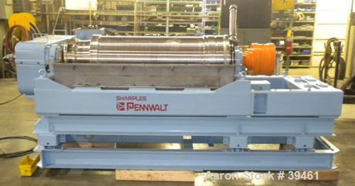 Used Sharples P-3400 Super-D-Canter Centrifuge. 2 Phase or 3 phase separation design (presently has plugs in the 3rd phase ports, just requires screw-in 3rd phase regulating tubes) 316 stainless steel construction (product contact areas), max bowl speed 4000 rpm, contour bowl design, 360 degree cake solid discharge ports with stintered tungsten carbide wear liners, 4.25" single lead conveyor welded hardfacing, centripetal pump liquid discharge, gearbox, drive motor 30 kw, lubrication system,base casing, safety guards. (Unit has had new bearings and seals installed)