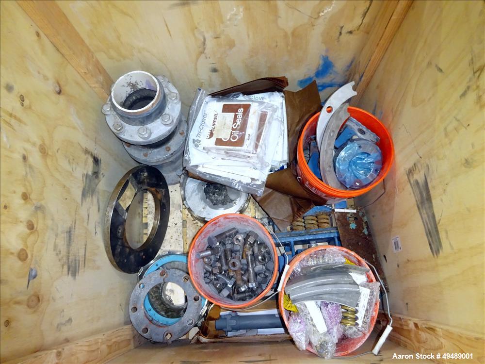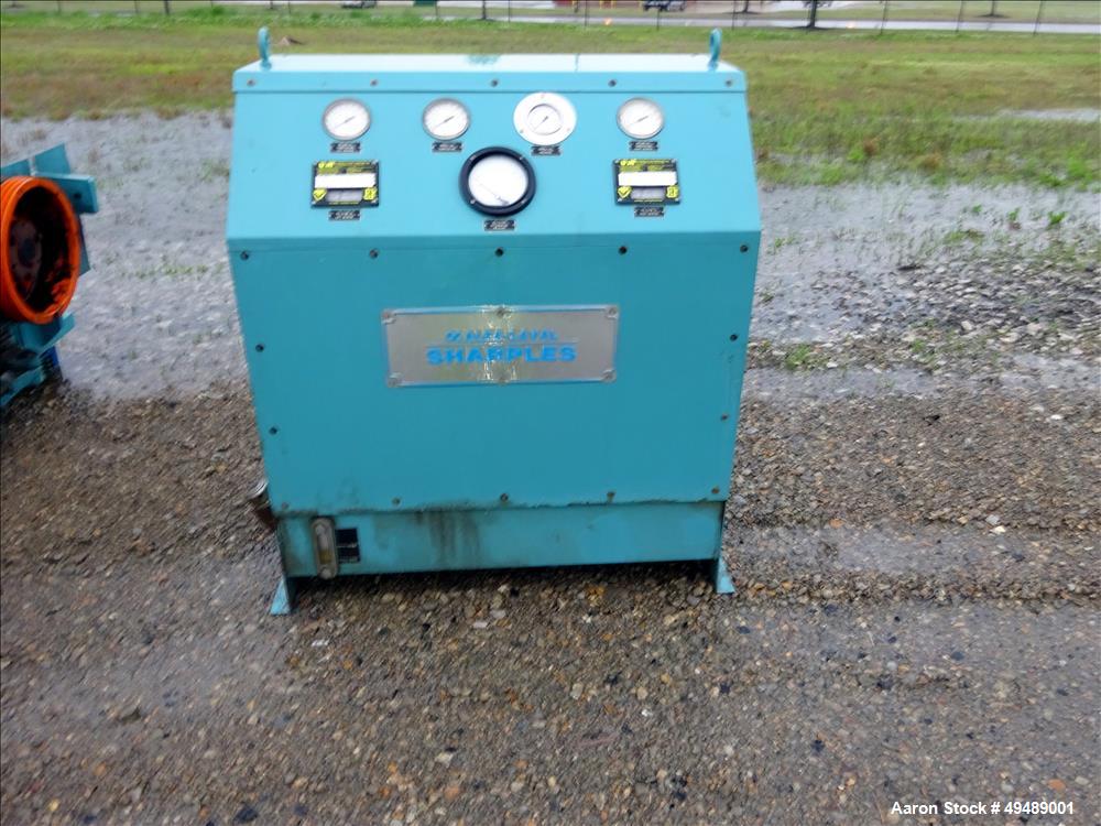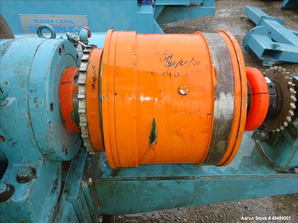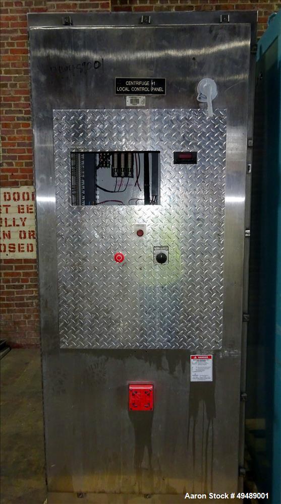Used Sharples PM-75000 Super-D-Canter Centrifuge, 317 stainless steel construction (product contact areas). Max bowl speed 2600 rpm. 360 Degree solid discharge ports with sintered tungsten carbide wear protection inserts, 10" single lead conveyor with sintered tungsten carbide wear protection tile, liquid plate dams. Base/casing with stainless steel top cover. Gearbox-P180/95, main drive sub-base, 150 hp, 3/60/460 volt, 1790 rpm main drive motor, 40HP DC back drive and sub-base, vibration isolators, lubrication system, feed pipe, safety guards. Serial# 93-PM75000AD-013.