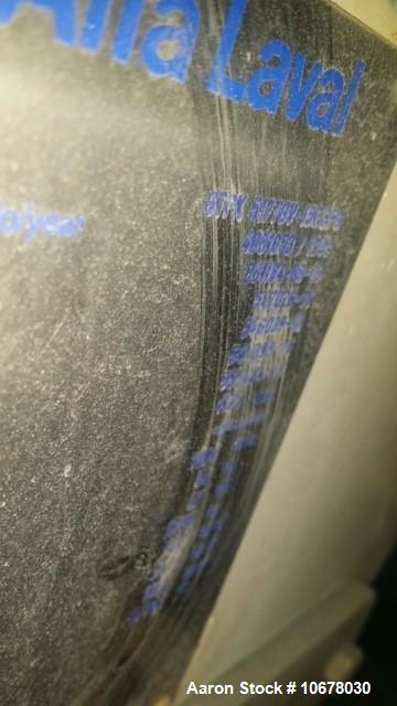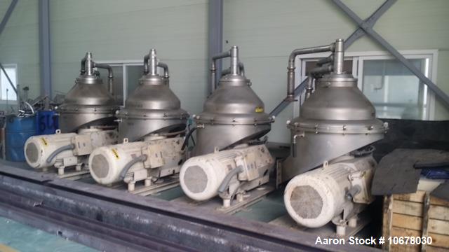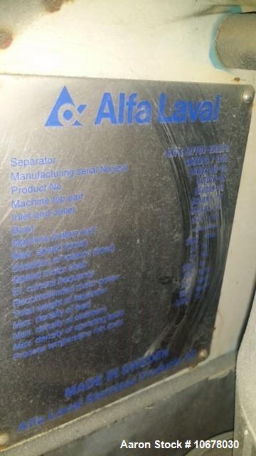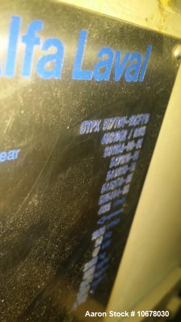 Used Alfa Laval GTPX-517-TGV-15CEFS Desludger Disc Centrifuge. 316 Stainless steel construction (product contact areas), gas-tight design, spark proof design, gas-tight at high pressures, maximum bowl speed 4135 rpm, three-phase separation design (liquid/liquid/solids separation), centripetal pump liquid discharge, deep sludge design lower casing, timed solid discharge, direct drive configuration (motor and separator on same base plate) with rigid coupling, 50 hp drive motor 460/3/60.