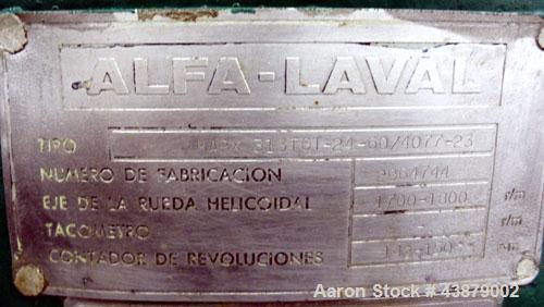 Used Alfa-Laval MAPX-313-TGT-24-60 Desludger Disc Centrifuge. Stainless steel bowl, Concentrator design (liquid/liquid/solids separation), 25 hp flanged mounted drive motor 208/230/460/3/60.(Reported to be set up for biodiesel). Approximate rated capacity on glycerin removal from biodiesel is 50 gpm. Rated capacity on diesel is 24,000 l/h.