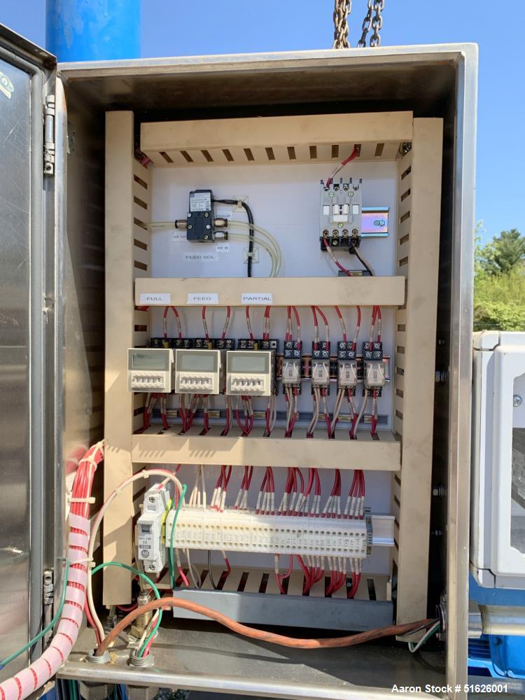 Used Westfalia SA-20-06-576 Desludging Disc Centrifuge. Stainless steel construction (product contact areas). Maximum bowl 6500 rpm. Driven by a 20hp, 3/60/230/460 volt, 1755 rpm motor. Clarifier design (liquid/solids separation), centripetal pump liquid discharge. STI model CMCP5301 -FG control system, stainless hopper, jib and hoist for bowl removal, 1.5hp centrifugal pump and misc. tools. Skid mounted.
