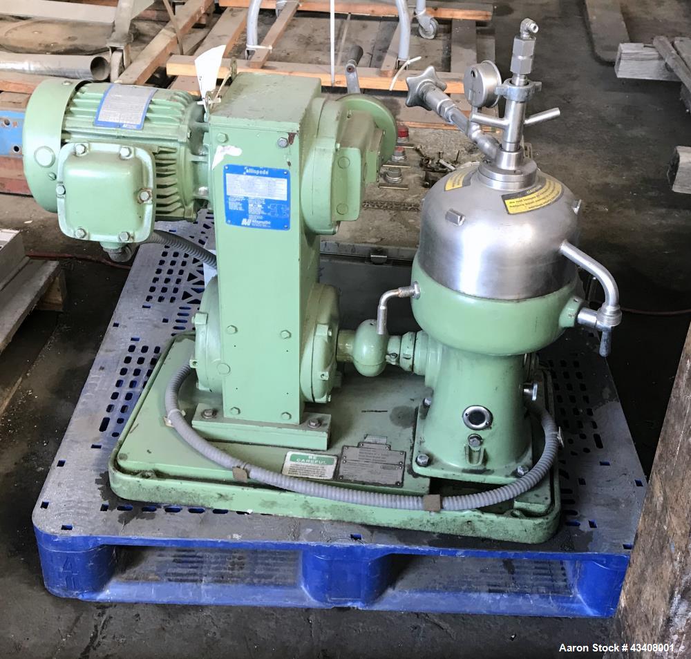 Used Westfalia KA-6-86-575 Solid Bowl Chamber Centrifuge, Stainless Steel construction (product contact areas), max bowl speed 9470 rpm, clarifier design, centripetal pump liquid discharge. vari-speed drive with 1.5 hp drive motor.