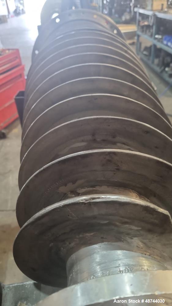 Used Flottweg Z42-3/441 Solid Bowl Tricanter Centrifuge. 316 Stainless Steel construction (product contact areas). Maximum bowl speed 3600 rpm, three phase separation (liquid/liquid/solids separation), conveyor, welded hardfacing, 360 degree discharge with wear liners, base, casing, feed pipe, Approximate 22 KW, 3/50/400 volt, motor, grease lubrication pump, mounts on carbon steel frame with 4 legs. Previous used in a olive oil application.