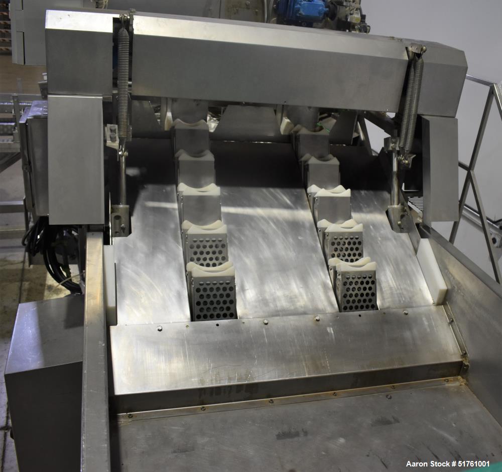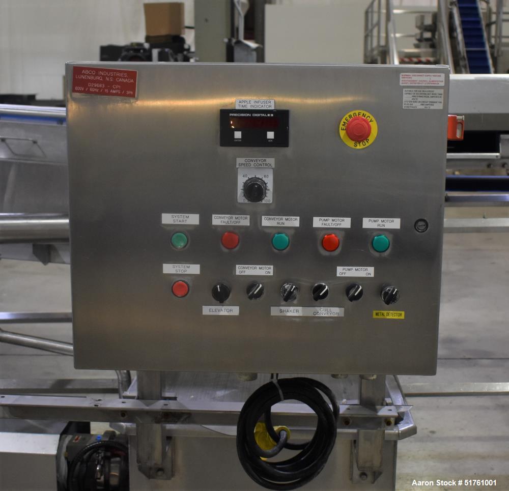Used ABL Apple Peeling, Corer and Washing Line. Consisting of ABL model PDS TT100 automatic apple peeler and corer with sectioning & ends cutting system. Input working capacity of 500 to 1,000 kg/hr. Workable sizes: small - 60 to 70mm, medium - 70 to 85mm, large - 85 to 100mm. Includes Inclined belt conveyor with tank, ABL model SHFL-100 "Shufflo" fruit feed system, ABL model SHKR vibrating table, ABCO industrial washer, misc belt conveyor. Peeler Serial # 253. Built 2007.