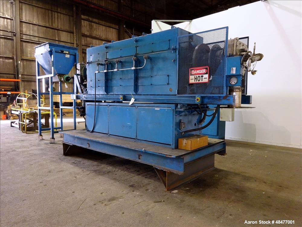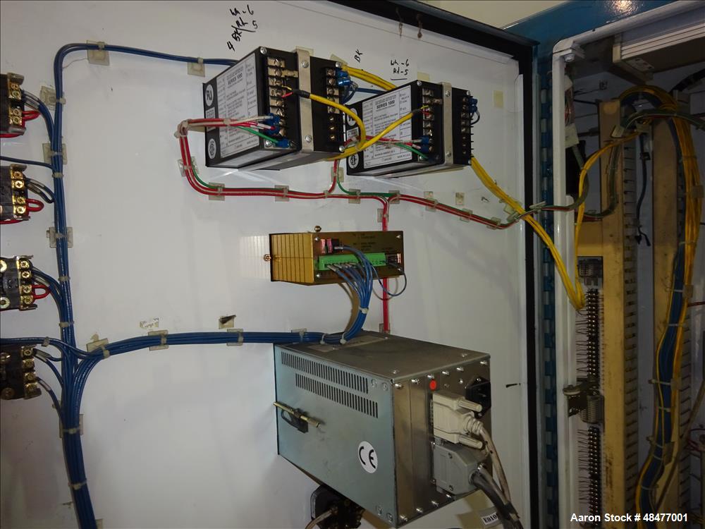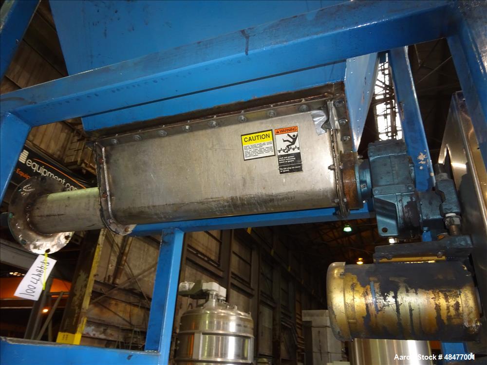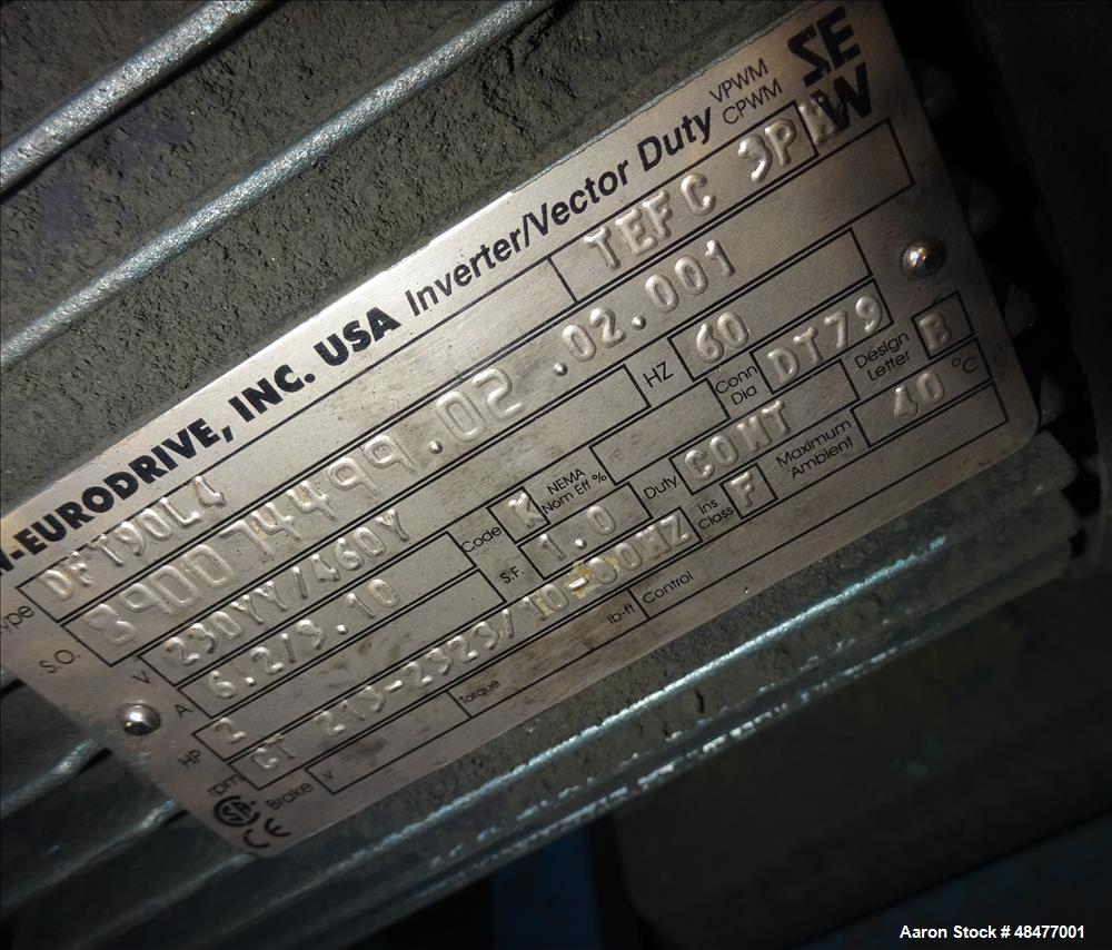 Used Harper Rotary Tube Furnace, Model NOU-12D96-RTA-18. Nominal internal diameter 12", Nominal outer diameter 13". Material CF-3 (304L), rotary tube seals 304L with graphite ring. 3 Independent control zones, (30) heating elements, rated to approximate 1,000 degrees C. (1832 F). Tube rotation 3 RPM +25% / -50%, angle of inclination 0 to 5". 17" Diameter bellows, loss-in-weight feeder type, hopper capacity 2.18 cubic feet, feeder rate 1-1/2 to 5 pounds a minute. Room air process atmosphere required 1500 scfh, cooling water supply at 2.5 gallons per minute, spray water flow pressure at 7 gallons per minute at 60 psi. Built 2002. Elec: 3/60/480V.