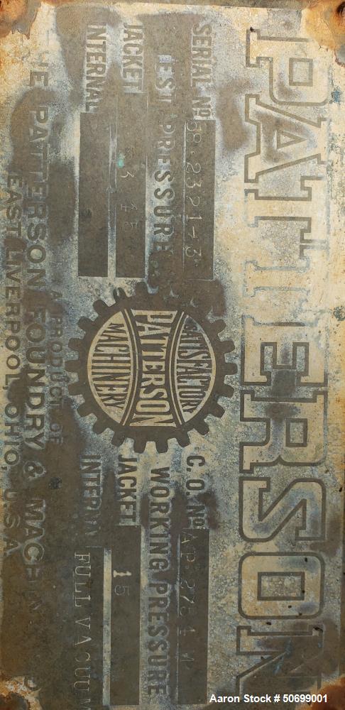 Used Patterson Double Cone Conaform Dryer, Model 1890. Size 132 cubic feet; 7'6", Stainless steel. Approximate design pressure 25 PSIG (jacket side). Approximate design temperature 300 degree F. 15 HP, discharge valve, 12" valve.