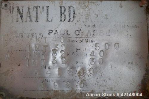Used Paul O Abbe Rota-Cone Vacuum Dryer, model 84RCVD, 304 stainless steel. 120 Cubic feet working capacity, 178 total. #4 Polished internal 84 diameter, rated 30 psi at 500 deg F to full vacuum. Carbon steel jacket rated 40 psi at 500 deg F coincident with full vacuum on internal. 20" diameter top port with cover, 8" center bottom outlet. Driven by a 10 hp, 3/60/230/460 volt, 1750 rpm gear motor with brake. Approximate 4 rpm cone. Mounted on carbon steel stands. Includes (1) hot oil system with expansion tank and stand, (1) separator tank, (3) Kinney vacuum pumps, model RT150C 7.5 hp, model KMBD1600 10 hp, model KLRC40KFA 5 hp; (1) Dean 5 hp hot oil pump, 1 hp lube system.