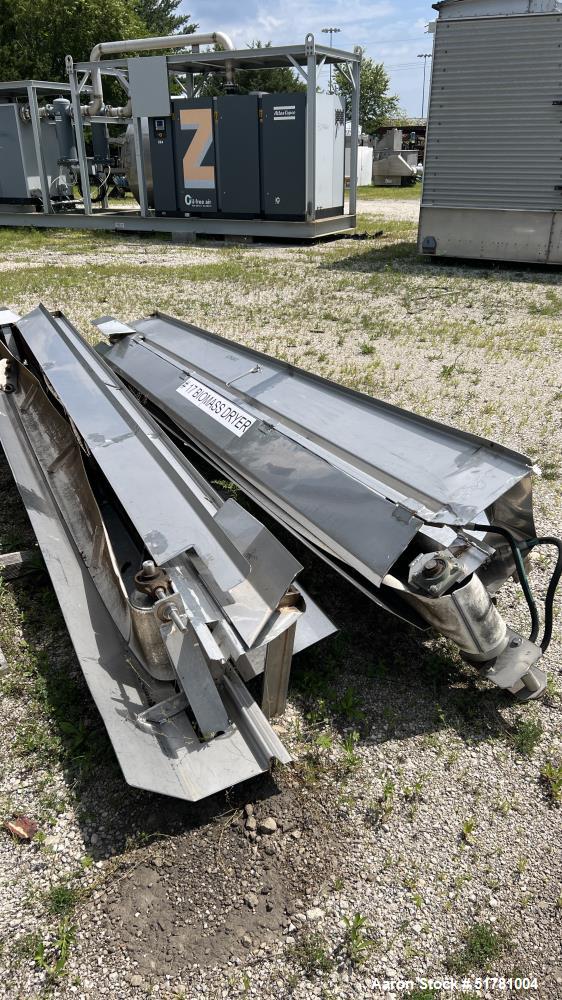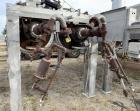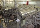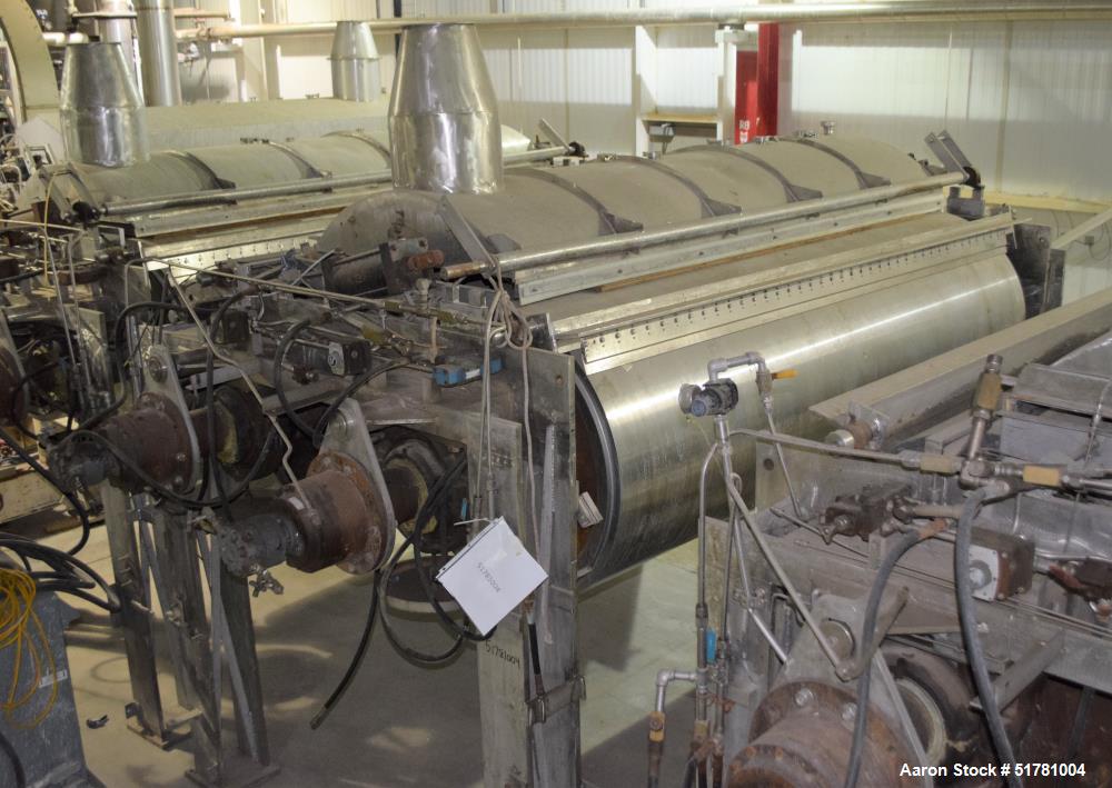 Used Double Drum Dryer. (2) Approximate 42" diameter x 120" face chrome plated rolls. Approximate rating 160 psi at 450 degrees F.. Each roll set up for a hydraulic drive. 15HP Hydraulic power pack. Dual knife scraper, top fume hood, edge guides and panel. Mounted on stainless steel end frames. (2) approximate 9" wide x 10 long side mounted discharge rubber belt conveyors. No NB Stamp