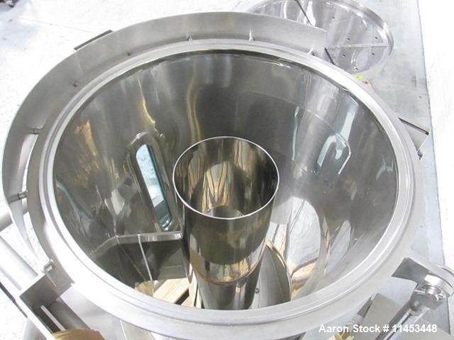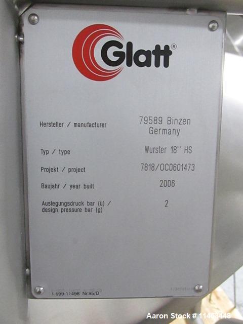 Used Glatt 18" Wurster HS insert 316L stainless steel construction, with expansion chamber and self dumping bowl with cylinder. Does not include spray gun and plate. Previously used with a Glatt GPCG 120m. Serial # 7818/OC0601473.
