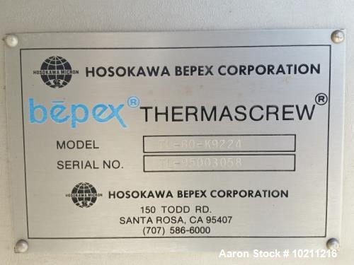 Unused- Hosokawa Bepex Rietz Processor / Blancher / Cooker, Model TL-60-K9224. For steam / boiling cooking corn, rice, potato, sweet potato, etc. Type 304 stainless steel construction (product contact parts) with incline screw discharge on drive end. Volumetric capacity of 375 cubic feet. Body: 60" diameter x 24' long braced and gusseted on structural steel skid base. Gravity feed top flanged inlet, six top-side hinged inspection hatches, nozzles and fittings for recirculation and drainage. Auger: nominal 60" diameter x 24' long, with a 20" pitch, continuously welded to shaft, counter-clockwise rotation. Discharger: permanently fitted to main body with access covers, 12" diameter incline screw conveyor. Powered by a 3 hp gear motor chain drive. 230/460 volt, 3 phase, 60 hz. Required utilities: Steam: 2160 lbs/hr (62 boiler hp); air: 1/2 cfm. Main drive power: 2 hp, 1750 rpm, 230/460 volt, 3 ph, 60 hz ac.