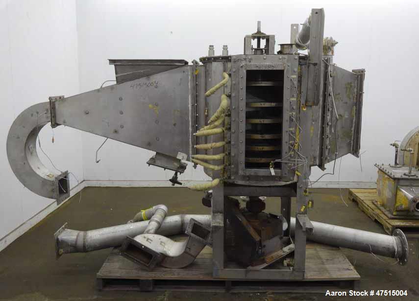 Used Wyssmont Style Rotary Tray Dryer, 304 Stainless Steel. Approximate 32" diameter x 32" tall chamber. (7) Rows of 10" wide trays with stationary wipers. Driven by a 3/8 hp, 3/60/230 volt gear motor, ratio 120 to 1. 3" Top feed, off center bottom outlet. Includes (1) Xchanger C series heat exchanger, Model C-175-6, (1) (1) Xchanger TV series heat exchanger, Model TV-100-3, (1) Sprout Waldron #1 stainless steel blower, driven by a 7.5 hp, 3/60/230/460 volt, 1750 rpm motor. Dryer mounted on a stainless steel frame. No manufacturers tag.