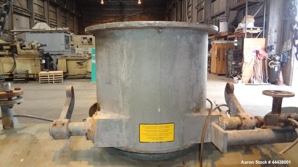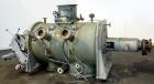Used Lodige Druvatherm Batch Type Vacuum Paddle Dryer, Type VTA 1200, 316 Stainless Steel. Approximate 28.3 Cubic feet (800 Liter) working capacity (42.3 total). Carbon steel jacketed chamber approximately 950mm (37.4") diameter x 1700mm (66.9") long. (1) End removable for telescoping shaft. Internal rated vacuum (-1) at 170 degrees C (338 F), jacket rated 7 bar (101 psi) at 170 degrees C (338 F). Shaft with fixed plows. (2) Side entering choppers with blades, 6.5-9 kW (8.7-12 hp) motors. Openings top 250mm (9.8") diameter charge port, 700mm (27.5") with a 2.4 square meter filter, rated vacuum (-1) at 170 degrees C (338 F), jacket rated 7 bar (101 psi) at 170 degrees C (338 F). 200mm (7.8") Center bottom outlet with a plug valve. Mixer driven by a 75kw (100hp), 3/50/380 volt, 1480 rpm motor thru a reducer, ratio 18.23 to 1. Includes a control panel, and miscellaneous framework.