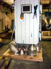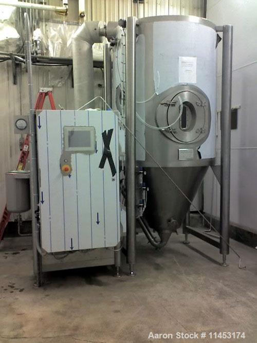 Used Anhydro MicraSpray Model 400 Spray Dryer System, Stainless Steel.Includes feed pump, feed tank, water tank and feed pipe, currently has a rotary type atomizer, the dryer has the capability to be converted to co-current two fluid nozzle atomizer (not included), air intake filter, electrical air heater, hot air duct drying chamber, rupture disc, cyclone with collection container, fan and ducts, control panel with PLC, graphical soft-touch color screen, support structure.