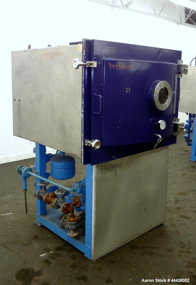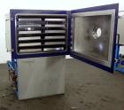 Used Klein GHS Vakuumtechnik Vacuum Shelf Dryer, Model VTS5. Approximately 5 Square meter (53 Square Feet) Shelf Area. (5) Approximate 39-3/8" wide x 39-1/4" deep x 1/8" thick 316 stainless steel dimple jacketed shelves, rated 2.5 bar (36 psi) at 120 degrees C. (248 F), spaced approximate 4-5/8" apart. Internal chamber 41-3/4" x 28-1/4" tall x 41-1/4" deep rated -1 bar (vacuum) at 120 degrees C. (248 F). Hinged front hinged door with a sight glass. Mounted on 4 legs.