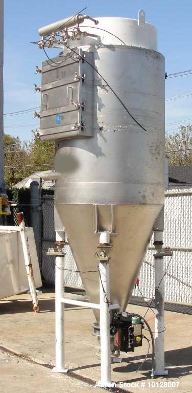 Used Walker Stainless Equipment Co Model R-HT-09 Round Pulse Jet Dust Collector. This dust collector has an estimated bag surface area of 82 square feet and has a 24" x 30" side access door for maintenance. The dimensions are 40" diameter x 56.5" straight side x 45" cone. The dust collector has (14) 6" diameter x 42" long bags, an 8" diameter pneumatic butterfly valve that reduces to a 4" diameter outlet, and (4) sheer beam load cells each with a 500 lb capacity. The overall dimensions are 40" wide x 40" long x 140" tall.