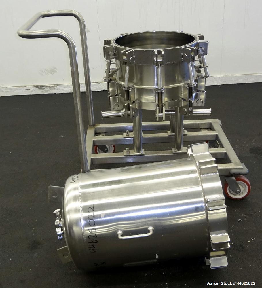 Used Cuno Zeta Plus Cartridge Filter Housing, Model 16ZPB3, 316 Stainless Steel. Approximately 104.1 square feet media area, requires filter cartridges. Quick release clamp design chamber rated 150 psi/full vacuum at -20 to 300 degrees F. 1-1/2" Tri-clamp bottom inlet/outlet. Mounted on 4 stainless steel legs and a cart with casters.