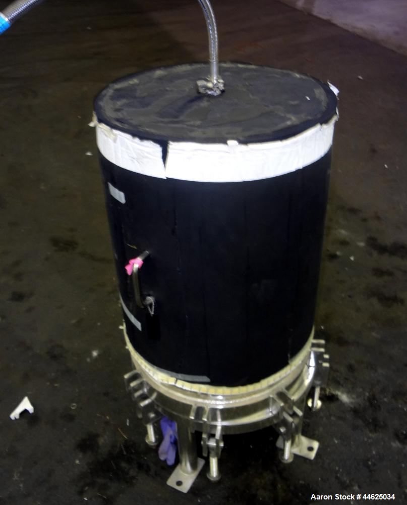 Used Stainless Fluid Products Cartridge Filter Housing, 3.8 Cubic Feet Capacity, 316 Stainless Steel. Requires filter cartridges. Quick release clamp design chamber rated 45 psi at -20 to 150 degrees F. 1-1/2" Tri-clamp bottom inlet/outlet. Mounted on 4 stainless steel legs.