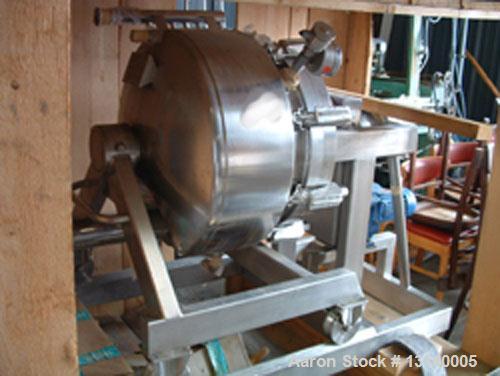 Used Diessel GMBH Approximately 30 Square Foot Rotating Leaf Jacketed Pressure Vacuum Filter. Sanitary T316L stainless steel construction. Horizontal tank 21-1/2" ID x 12" deep, electropolished internally with clamps. ASME code stamped full vac/87 psi internal, 43 psi jacket @ 300 deg F. Stationary flat head with shaft mounted leaves, tank rolls back on stainless steel track to expose leaves. Has six (6) stainless steel leaves 21" diameter with 1-1/2" space between the leaves. Rotation of shaft mounted leaves is via chain and sprocket drive, sew Eurodrive with 0.8 kW motor, gear reducer with handwheel for varying the speeds. Fitted with seven (7) wash nozzles in tank for sluicing of the leaves. Can also be used for dry cake discharge. Built 1998 but not used.