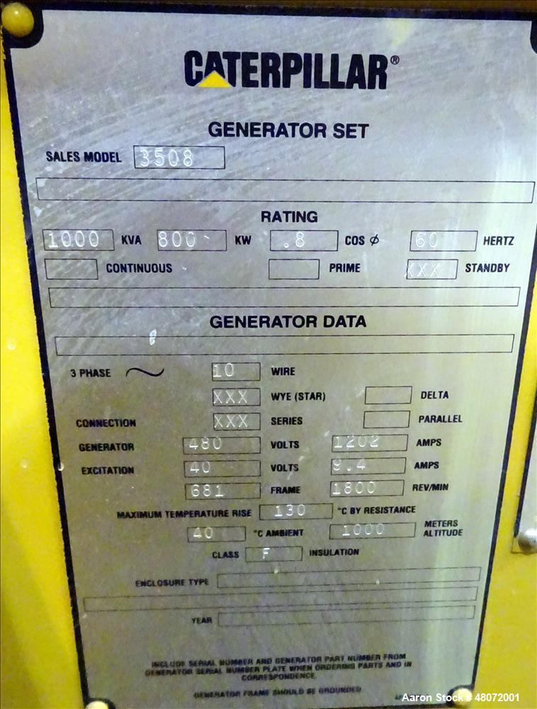 Used Caterpillar 800 kW standby diesel generator set. CAT 3508 engine rated 1199 HP at 1800 RPM, SN-23Z05756. 3/60/277/480V. 1200 Amp main-line circuit breaker. EMCP II digital control panel. Coolant heater. Open skid. Muffler flex, no muffler. 414 Hrs. Yr 1994. CAT factory worldwide extended warranty available for up to 2 years at additional cost. Passed load test 4/12/2016