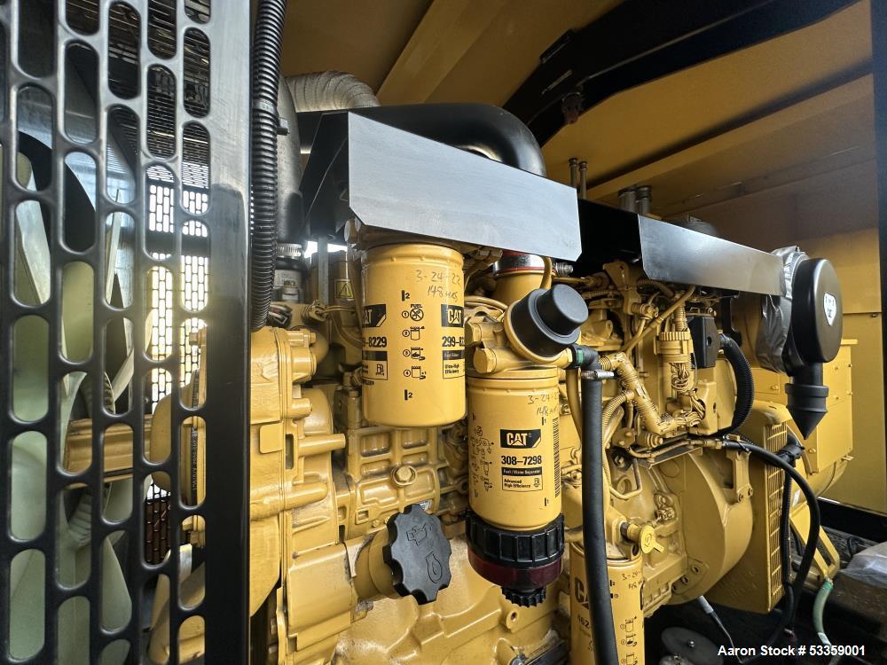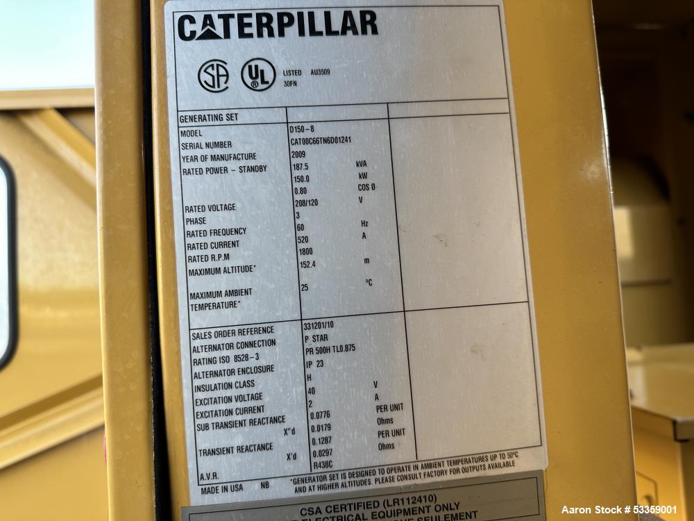 Used Caterpillar 150 kW standby (135 kW prime) Diesel Generator Set, Model D150-8, SN-N6D01241. CAT C6.6 engine rated 230 HP at 1800 RPM, SN-E6M01664, EPA Tier 3 emissions. 3/60/120/208V, 12 lead reconnectable to other voltages. 250 Amp main-line circuit breaker. PMG - Permanent magnet generator. UL 2200 listed. EMCP 3.2 digital control panel. Battery charger. Coolant heater. Sound attenuated enclosure. 393 gallon UL listed sub-base fuel tank with secondary containment. 154 Hrs. Year 2009.