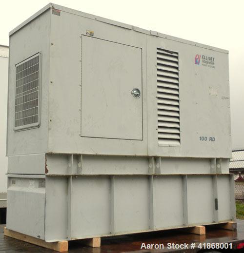 Used Elilott Magnetek 100 kW standby diesel generator Set, model 100RD, SN-8108J552. Perkins model 1006-6T turbocharged engine rated 154HP at 1800RPM. MagneTek model MTG35 generator 3/60/208/240/460V, 12 lead re-connectable, 400 Amp main-line circuit breaker. Rated 65kW single phase. Battery charger, block heater. Weather enclosure. Approximately 400 gallon UL rated sub-base fuel tank. 86 hours.