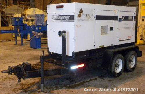 Used MQ Power / Multiquip Whisperwatt trailered 110 kW standby rated / 100 kW prime rated diesel generator set. Whisperwatt model DCA-125SSJU, SN-7500387. John Deere model 6068TF250, SN-PE6068T055366, 6 cylinder, 4 cycle turbocharged engine rated 150 hp @ 1800 rpm. Generator model DB-1381J, 3/60/240/480 volt, reconnectable to 208, 220, 240, 416, 440, 480 volts, available single phase 120, 127, 139, 240, 254, 277. Fuel tank 63 gallon capacity. Sound attenuated enclosure rated 67 dB(A) full load @ 23 feet. 6386 hrs. Yr 1999.