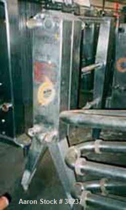 Used APV Plate Heat Exchanger, Model HX, Stainless Steel. Approximately 70 square feet. (54) 9" wide x 34" long plates. 24-1/2" open rail, 1 type tightening bar. (4) 2" bevel seal inlets/outlets.