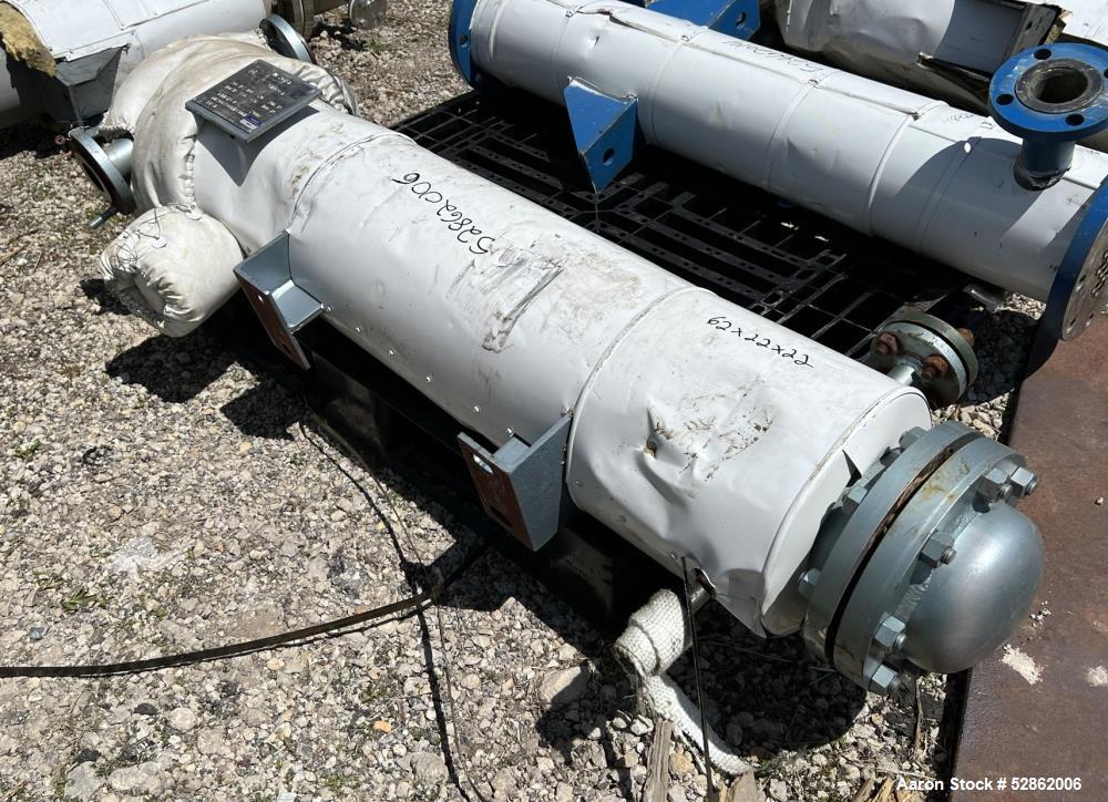 Used Doyle and Roth Shell and Tube Heat Exchanger, Approximate 13 Square Feet, Horizontal. Carbon steel shell rated 200psi / FV at -20 to 400 degrees F. (16) Approximate .75" diameter x 48" long Hastelloy C-276 tubes rated 100 psi / FV at -20 to 350 degrees F. Openings: (2) 2", (2) 1", (2) 3/4". Single pass shell side, 4 pass tube side. Baffle spacing 12". Saddle Mounted. National Board# 20731, Serial# S1989-1, Built 1998.