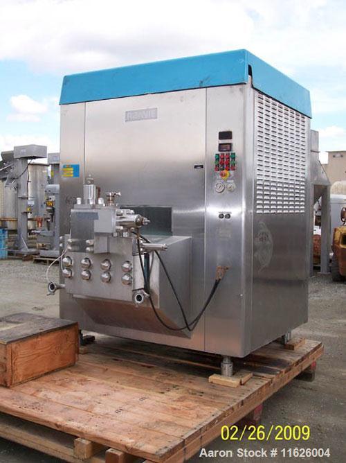 Used APV Rannie Blue Top model BT 45-120H homogenizer, two stage valve assembly, ball valves with three part valve housing and ceramic plungers. Was originally supplied to operate at 10,000 psi max and 1700 gph. Unit come with Allen Bradley SMC Plus Smart Motor Controller, (2) pulsation dampeners, Allen Bradley SLC 5/02 controller and 200 hp motor.