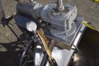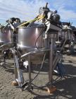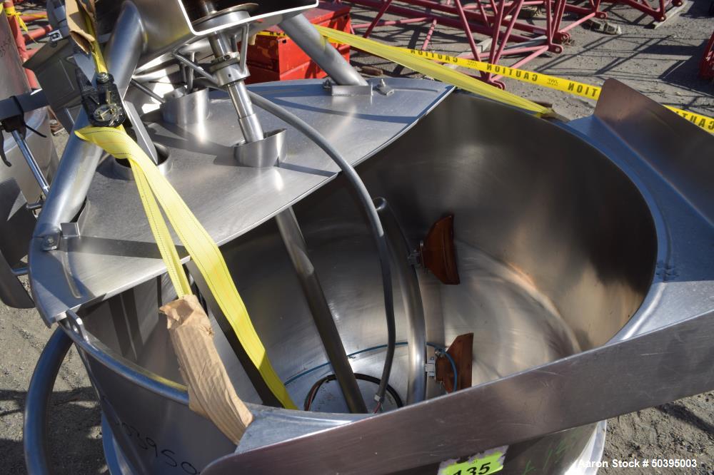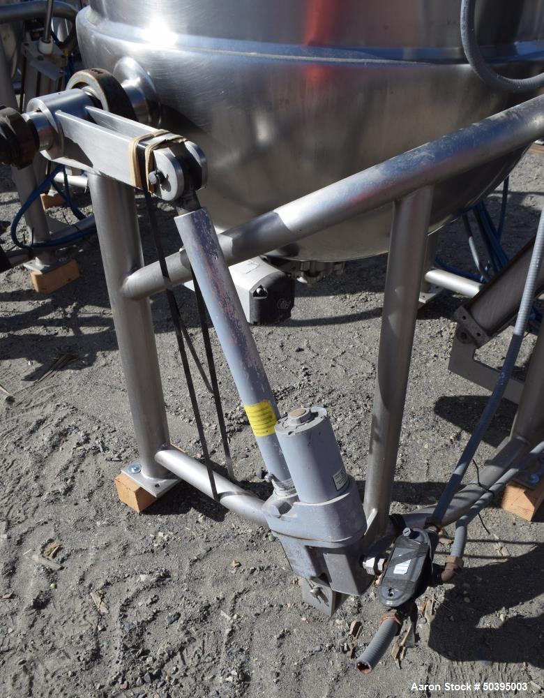 Used Hamilton Style CW Tilting Kettle, 150 Gallon, 316 Stainless Steel. Approximate 44" diameter x 40" deep. Open top, jacketed hemispherical bottom. 304 Stainless steel jacket rated 100 psi at -20 to 328 degrees F. Top entering angled anchor style agitator with scrapers, driven by a 2 hp, 3/60/208-230/460 volt, 1750 rpm gear motor, approximate 44.32 to 1 ratio (no gearbox tag). Air operated agitator tilt, motorized bowl tilt, pouring lip. 3" Center bottom outlet with valve. Mounted on a stainless steel frame with (3) leg. National Board # 17. Serial # F-4662-3. Built 2002.
