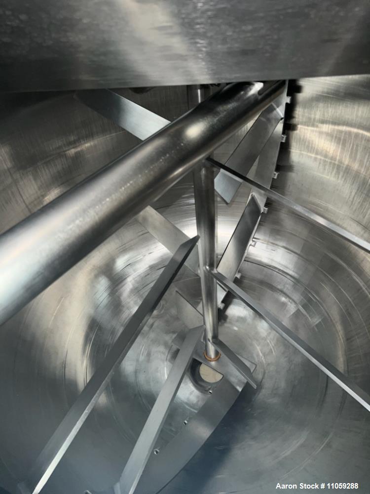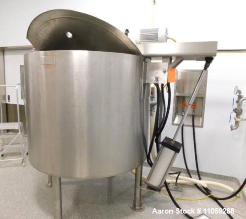 Used 400 Gallon Lee Sanitary Jacketed Double Motion Mix Kettle with scrape agitation. Model # 400D9MT. Dish Bottom. Double motion agitation. Stainless Steel. Jacket rated 90 PSI @ 332 Deg.F. MDMT -20 Deg.F.. Double Hinged Lid. Lift out agitation with Actuated Agitator assist. No scraper blades included. Last used in Sanitary Pharmaceutical application. Built 1996. It has a 5 HP drive with 83.3:1 gear reducer. Approx 3"-4" discharge opening on the bottom where a flush mount valve would go, the valve is not included. The cylinder for agitator lift is air operated. Electrics: 3/60/230/460 volt. Approx 21 RPM output speed.