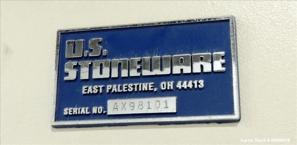 Used U.S. Stoneware Ceramic Ball Mill, 52 Gallon. Approximate 33" diameter x 28" long, dished ends. Inlet & outlet with cover. Driven by a 3hp, 3/60/208-230/460 volt, 1725 rpm motor, with Stearns brake and a gear reducer 25.56 to 1. Mounted on carbon steel legs with a discharge housing. Serial# AX98101.