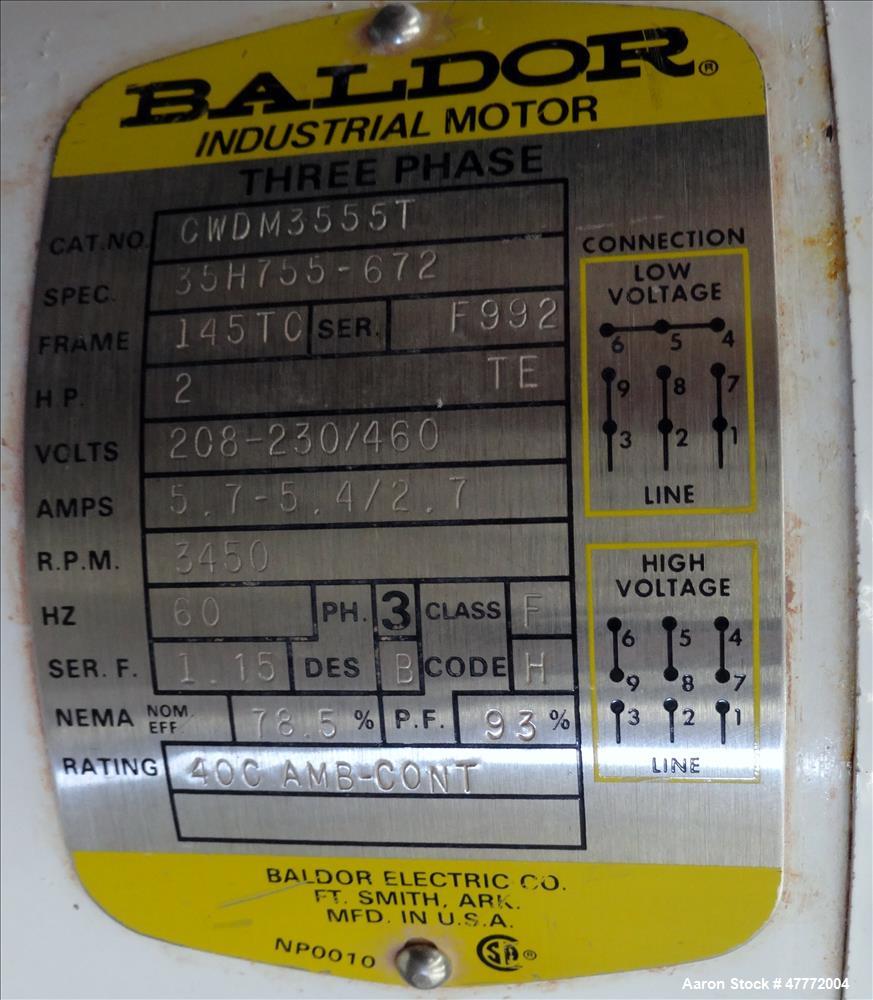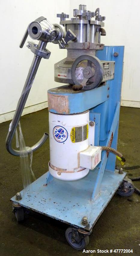 Used Greerco Vertical Colloid Mill, Model W250VB, 316 Stainless Steel. Jacketed stator housing. Rated approximately 20 gallons per minute depending on product. Approximate 2" diameter (6) blade rotor, 1" tri-clamp inlet with hopper, 1" side outlet. Driven by a 2hp, 3/60/208-230/460 volt, 3450 rpm motor. Serial#339-3414, built 1991. Feed hopper connection needs to be welded back together. Sold as is.