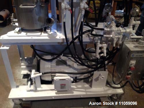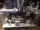 Used Myers Triple Shaft Mixer/Disperser, Model HVL 550/500-7.5-1242. Approximately 4 gallon, 10.5" diameter x 12" deep. Jacketed, vacuum rated mixing chamber. Motor is 7.5 HP, Explosion proof (XP) UL rated. Sweep blade with scraper. Disperser and screw type agitation. Hydraulic lift, mounted on frame with wheels. Model RAM-207 discharge press. Last used in sanitary application in toothpaste.