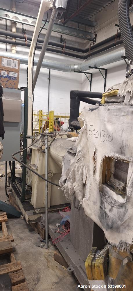 Used Ross AMK Class V Double Arm Kneader Extruder, 15 Gallon (60 Liter) Working Capacity, 304 Stainless Steel. Jacketed bowl approximate 19-5/8" left to right x 19" front to back x approximately 20" deep, internal rated -1 bar at 200 degrees C., jacket rated 3 bar at 200 degrees C. Air operated domed top cover, suitable for vacuum, with sight glass and light, hinged safety grate. Tangential sigma style blades, geared one end. Approximate 5" diameter discharge screw with slotted die. Mixer driven by a 20hp, 3/60/230/460 volt, 1765 rpm motor, screw driven by a 5.5hp, 3/60/230/460 volt, 1740 rpm variable speed motor thru a dual reducer. Includes a control panel. Mounted on a stainless steel & carbon steel base. Serial # 12425.