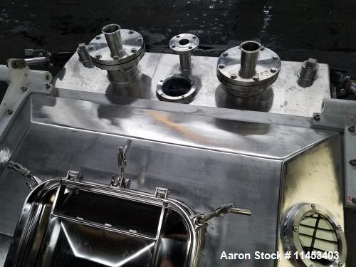 Used Jaygo Guittard Mixtruder, Model ME1600L. 304 stainless steel product contact surfaces. 2000 Liter total, 1250 liter working capacities. Tangential sigma blades, independently driven variable speed blade with 55 kw motor drive front blade with 71.1:1 gearbox ratio, 45 kw motor drive rear blade with 88.8:1 gearbox ratio. Extruder discharge screw driven by 55 kw motor drive with 80.3:1 gearbox ratio, with die face cutter accessory with discharge shroud. Jacketed chamber and end rated 4 bar (58 psi) at 180 degree C. Jacketed extrusion chamber rated 3 bar (43.5 psi) at 180 degree C. Vacuum cover hydraulically activated with 1.5 kw hydraulic pump, control panel with front and rear blade VFD controllers, extruder screw VFD controller, operator control panel, 460 volt, 3 phase, 60 hertz. Built 2013.