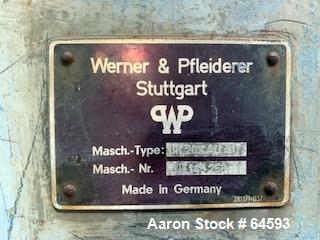 Used Werner & Pfleiderer Mixer/Extruder, Type UK20X-AU-4V. 316 Stainless steel construction. Total capacity 793 gallon (3000 liter); working capacity 530 gallon (2000 liter). Bowl 56.6" x 65.5" x 54.6" deep (1450 mm x 1680 mm x 1400 mm deep). Sigma style blades, 7.8" (200 mm) diameter style. Double jacketed, rated for 180 psi (12 bar) and vacuum. 11.7" (300 mm) discharge screw. Driven by a Flender #177-110-115-7A gearbox, 57 hp/38 kw. Sonder 1/728. Blade speed N1 465-265 rpm. N2 15/112-5 rpm. No motor. Rated for 78/52 kW - 117/78 HP on blades, 45/90 kW - 67.5/135 HP on screw. Overall dimensions (mixer only) are: 189" long x 6'2" wide x 8'9" high (5800 mm long x 2000 mm wide x 2750 mm high). Weight 14.8 tonnes.