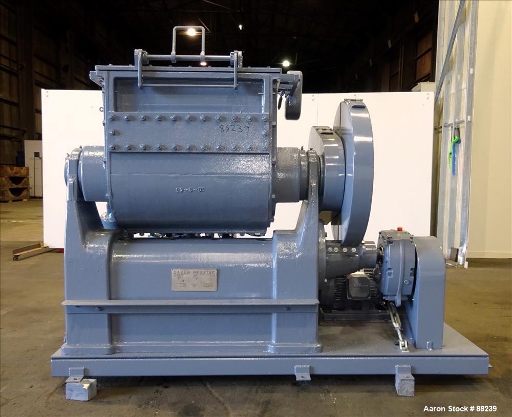 Used/Reconditioned- Baker Perkins Double Arm Sigma Blade Mixer, 100 Gallon Capacity, Model #15. Carbon steel jacketed bowl 33" left-right x 38" front-back x 30" deep. Driven by a 30 hp, 3/60/230/460 volt, 1770 rpm motor with speed reducer. Hydraulic tilt, power pack driven by a 7.5 hp motor. Mounted on a painted carbon steel base. Serial # 41090. This mixer is offered as is.