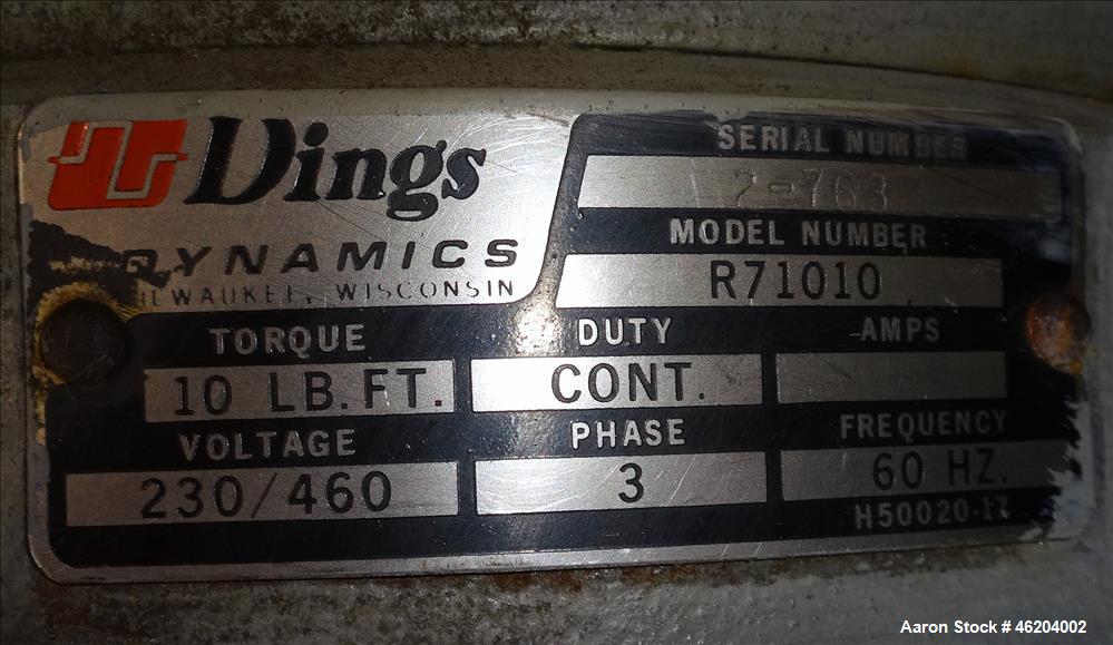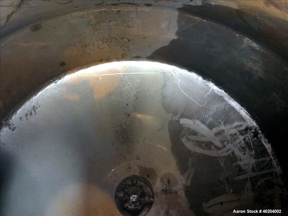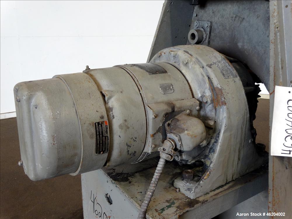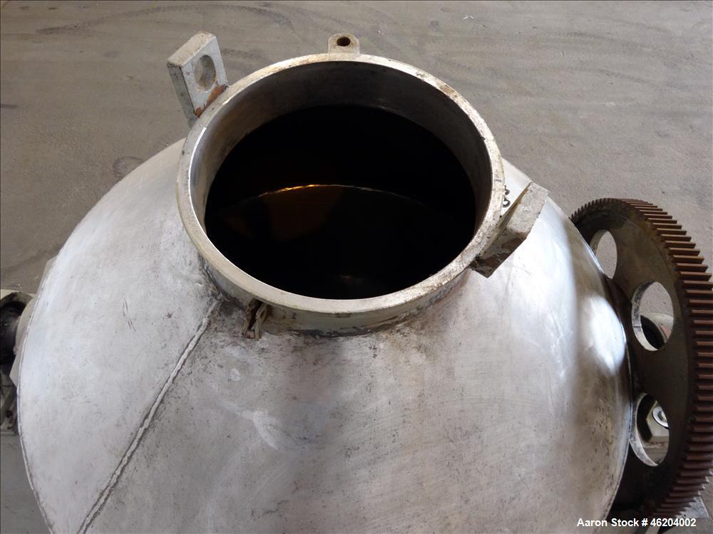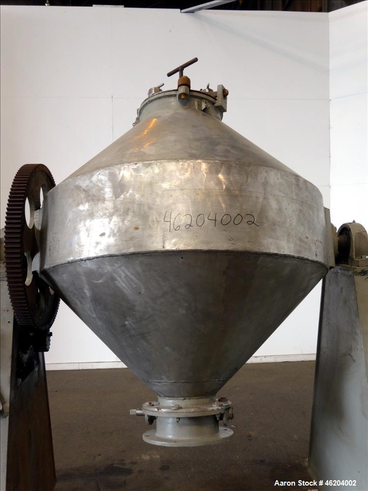 Approximately 52" diameter x 13" straight side x 24" cones. 16" Diameter charge port with cover, 10" diameter center bottom outlet with 6" diameter manual valve. Driven by approximately 3 hp, 1800 rpm gear motor. Mounted on carbon steel stands. No manufacturer's tag.