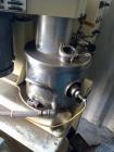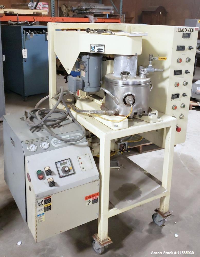 Used Ross Triple Motion Mixer, Model PVM2. Stainless Steel. 2 gallon stainless steel jacketed change can. Vacuum mixer. Triple mixers including (1) 1/2 hp 3 phase 60 cycle 208-230/460 volt 1725 rpm three wing anchor agitator with scrapers on side and bottom of can. (1) 3/4 hp 3 phase 60 cycle 208-230/460 volt 3450 rpm High Speed disperser. (1) 3/4 hp 3 phase 60 cycle 208- 230/460 volt 3450 rpm high shear rotor stator mixer. Mixer motors 30 Hp 3 phase 60 cycle 230/460 volt 1765 rpm. Change can is jacketed and on castors. Hydraulic lift. Includes Mokon heater. Model DB41109BF, 3 phase 60 cycle 460 volt 9 kw. Mounted all on mobile cart. Motors are Explosion Proof, The controls are not.