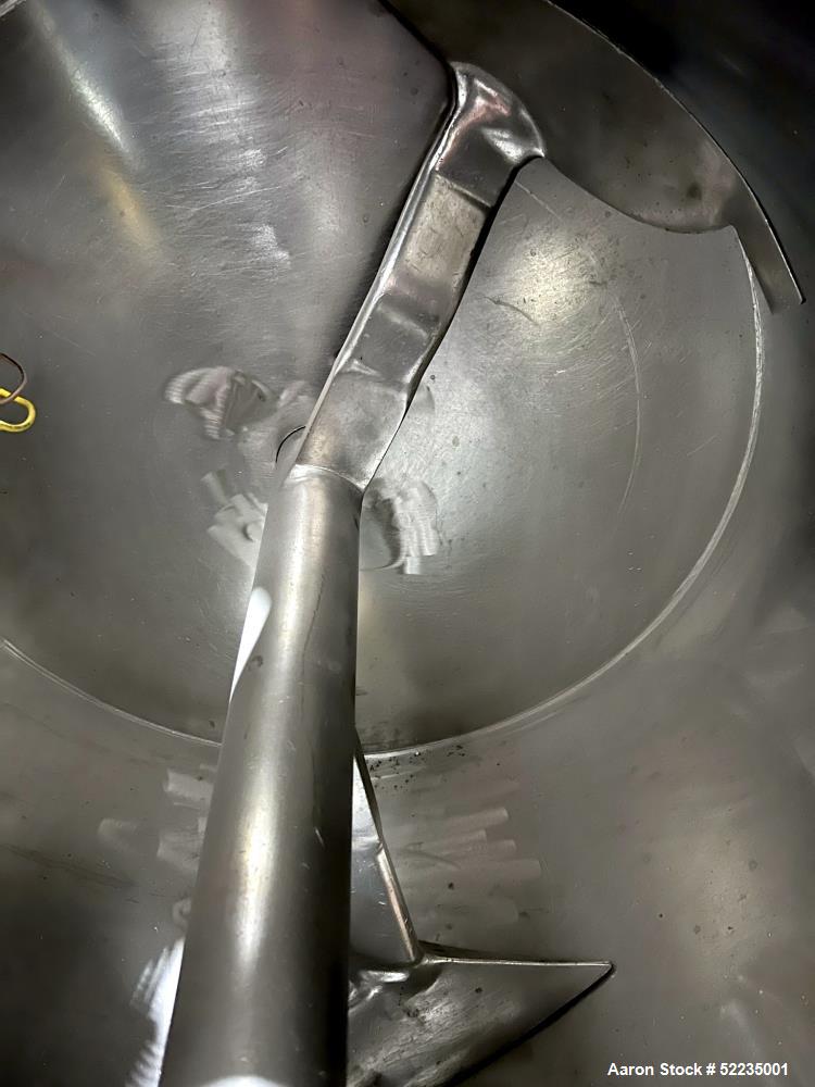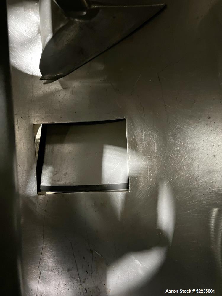 Used Littleford Style "Batch Type" Plow Mixer 13 Cubic Feet Working Capacity (21.9 total), 304 Stainless Steel. Non-jacketed chamber approximate 30-7/8" diameter x 49" straight side. Approximate 3-1/2" Diameter shaft with welded plows and (2) end scrapers. Driven by a 20hp, 3/60/208-230/460 volt, 1770 rpm gear motor, 12.56:1 ratio. Air purge seals. Openings top" 14", 6", (2) front access doors. 7-1/4" x 9-1/4" Center bottom outlet with air operated door.